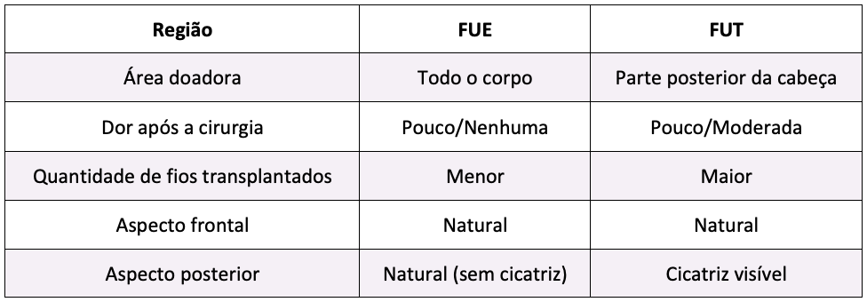FUT - envolve a retirada de uma faixa do couro cabeludo para extrair as unidades foliculares a serem transplantadas;